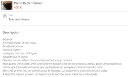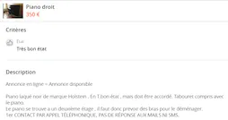 Ci-dessous voici deux exemples de petites annonces pour des pianos droits qui sonnent comme des “je vous en supplie, débarrassez moi de ce piano, seul meuble restant dans mon salon !” où votre marge de négociation sera grande !