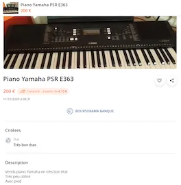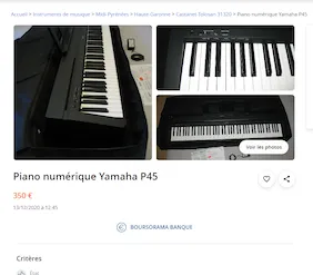 Voici un exemple d’instrument qui a un potentiel intéressant avec ce Yamaha P-45 qui semble presque neuf. On trouve facilement son prix neuf actuel sur des moteurs de recherche. D’occasion il est bien moins cher. S’il est en bon état, la question est “pourquoi le vendeur le vend ?“. Si la réponse vous rassure, alors go. Et surtout, toujours tenter de négocier le prix à la baisse. Cet instrument neuf à 429€ minimum, vous pouvez tenter de l’avoir à 300€ avec le particulier qui le vend.